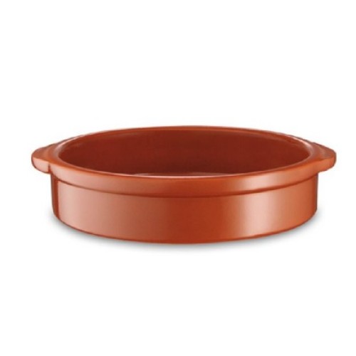 Cazuela de barro rústica barnizada en el interior. Puede usarse en cocinas de vitrocerámica gracias al diseño de la base. Ideal para cocinar al horno o al microondas.
